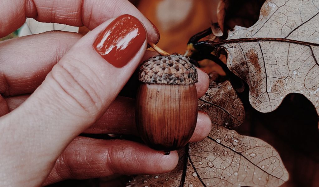 Download 1024x600 acorn, oak, leaves, hand, autumn wallpaper, background netbook, tablet