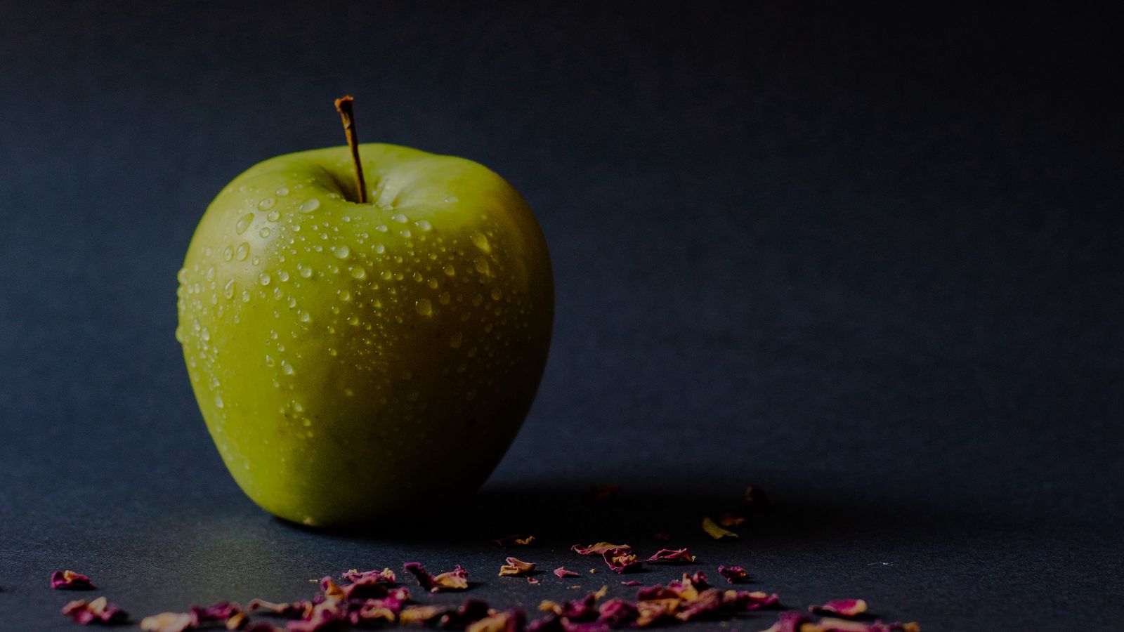 Download 1600x900 apple, green, wet, ripe, petals wallpaper, background widescreen 16:9