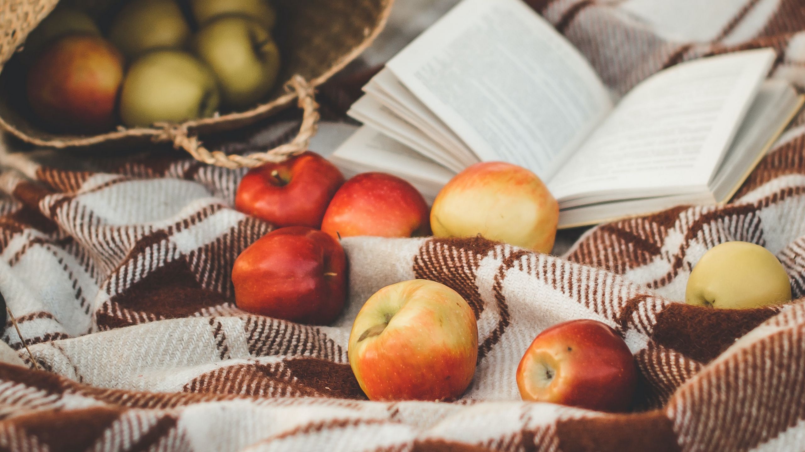 Download 2560x1440 apples, basket, book, plaid wallpaper, background widescreen 16:9