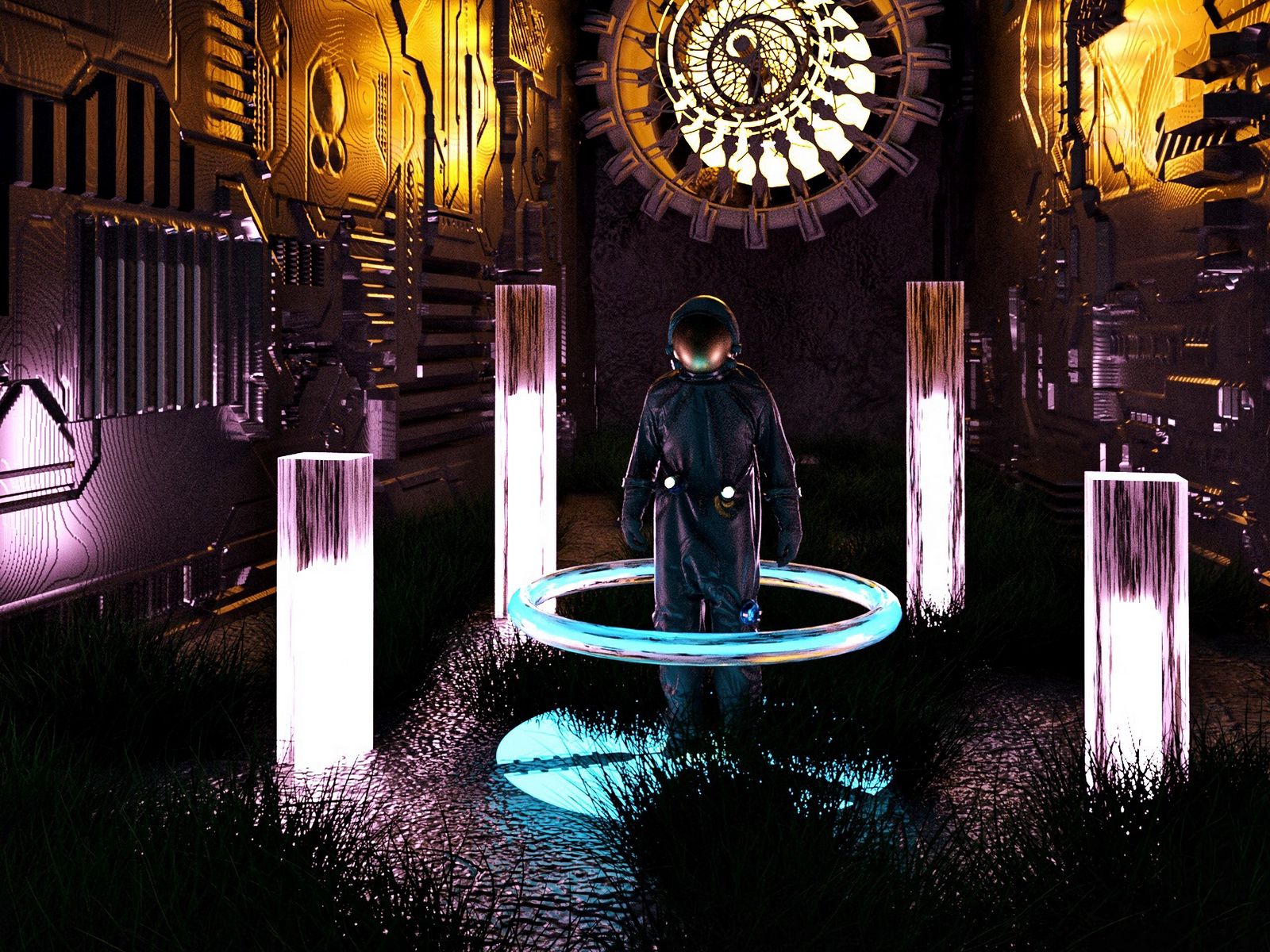 Download 1600x1200 astronaut, ring, pillars, glow, portal wallpaper, background standard 4:3