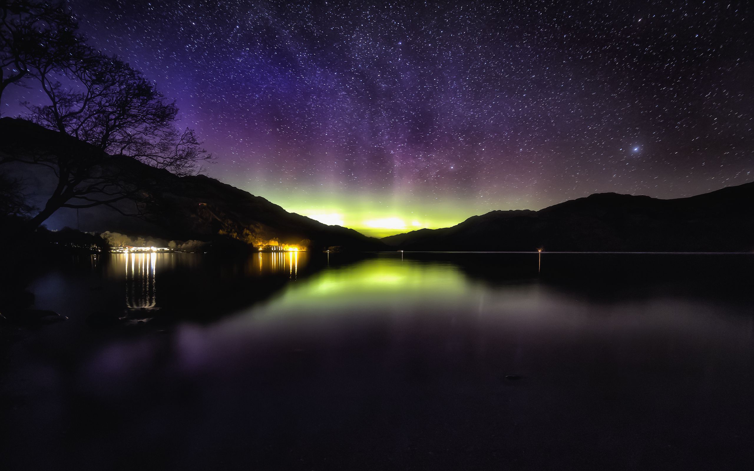 Download 2560x1600 aurora, starry sky, night, loch lomond, scotland wallpaper, background widescreen 16:10