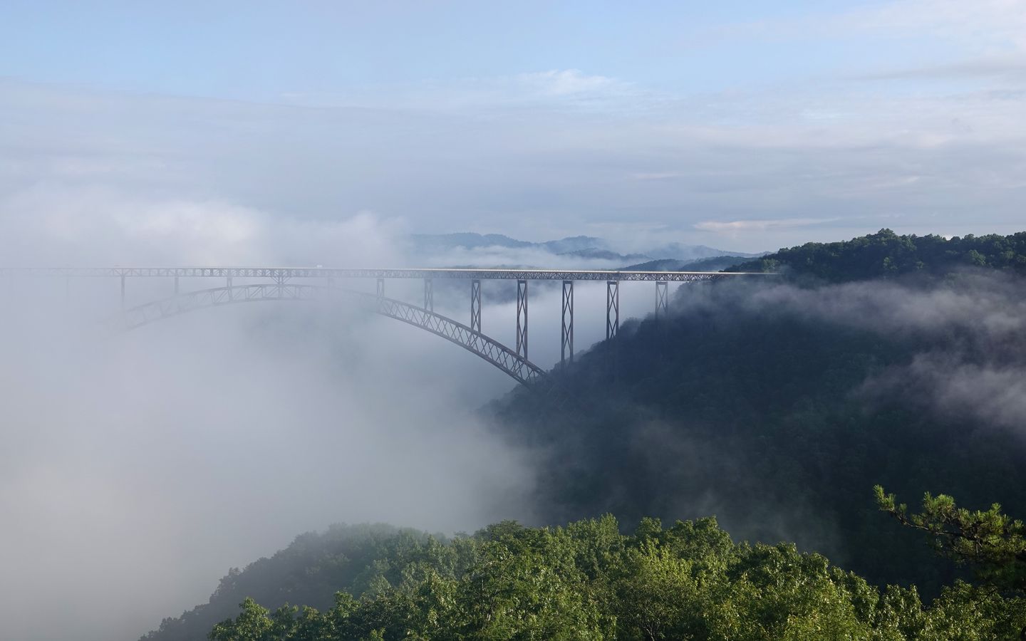 Download 1440x900 bridge, fog, trees, forest wallpaper, background widescreen 16:10