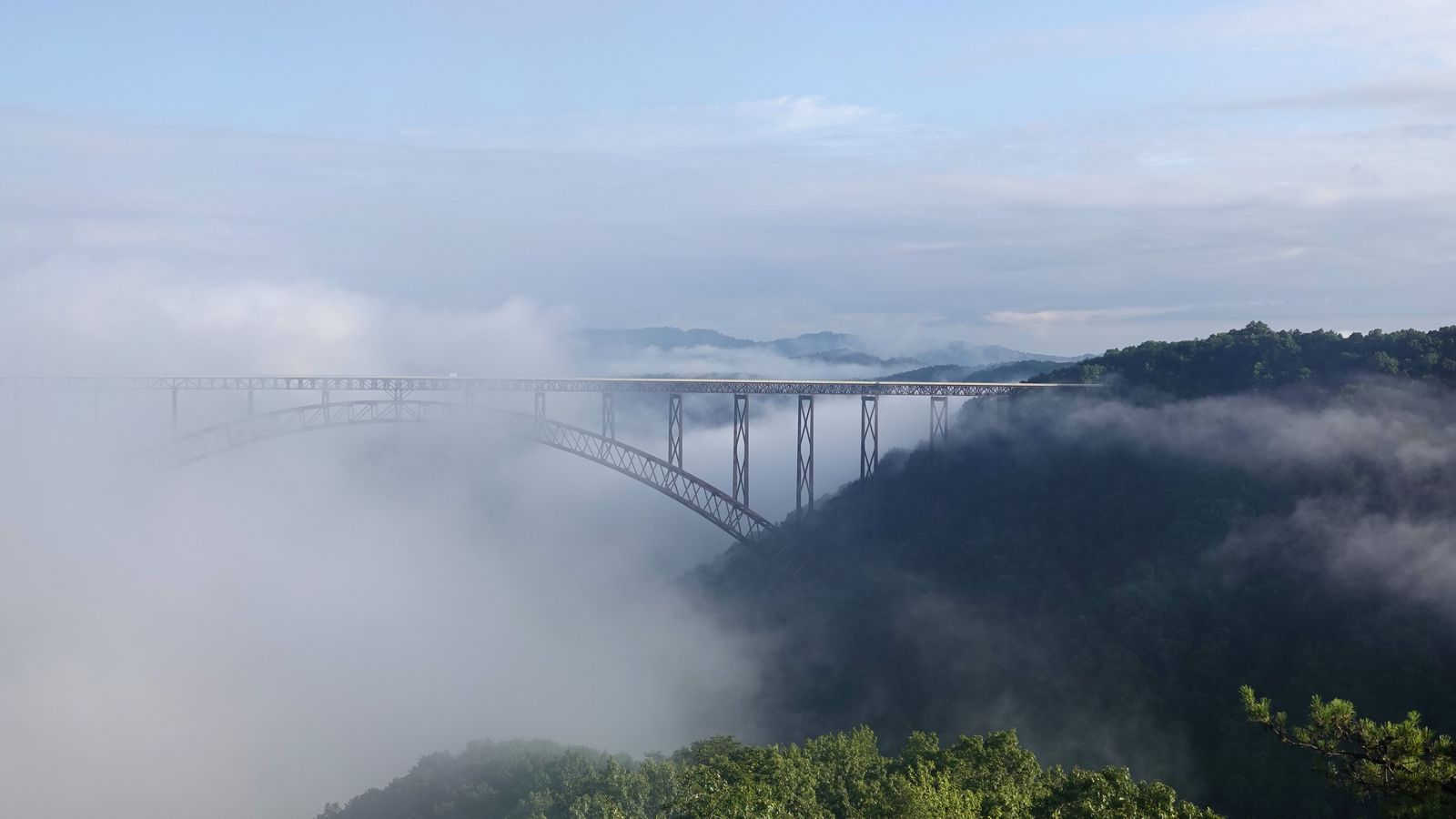 Download 1600x900 bridge, fog, trees, forest wallpaper, background widescreen 16:9