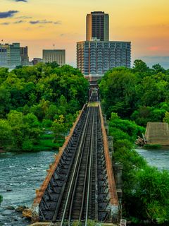 Download 240x320 bridge, railway, river, city, sunset, landscape wallpaper, background old mobile, cell phone, smartphone