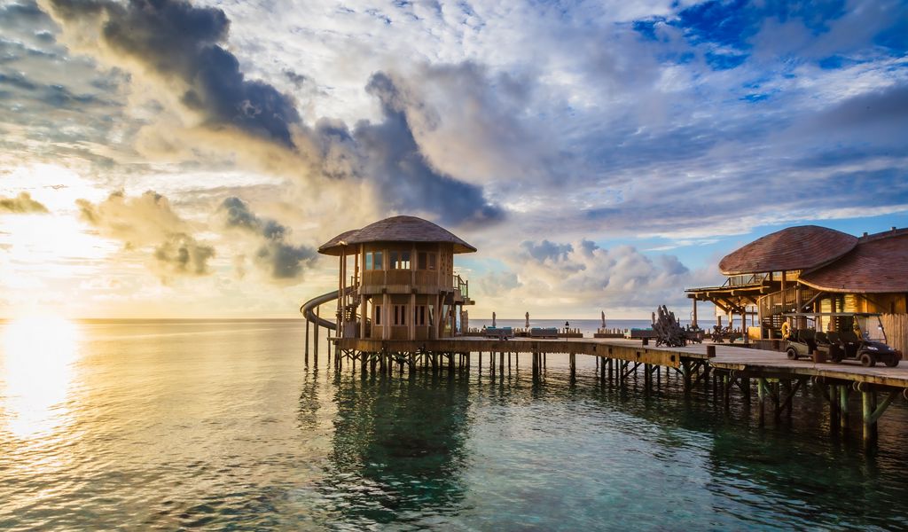 Download 1024x600 bridge, sea, buildings, sun, sunset wallpaper, background netbook, tablet