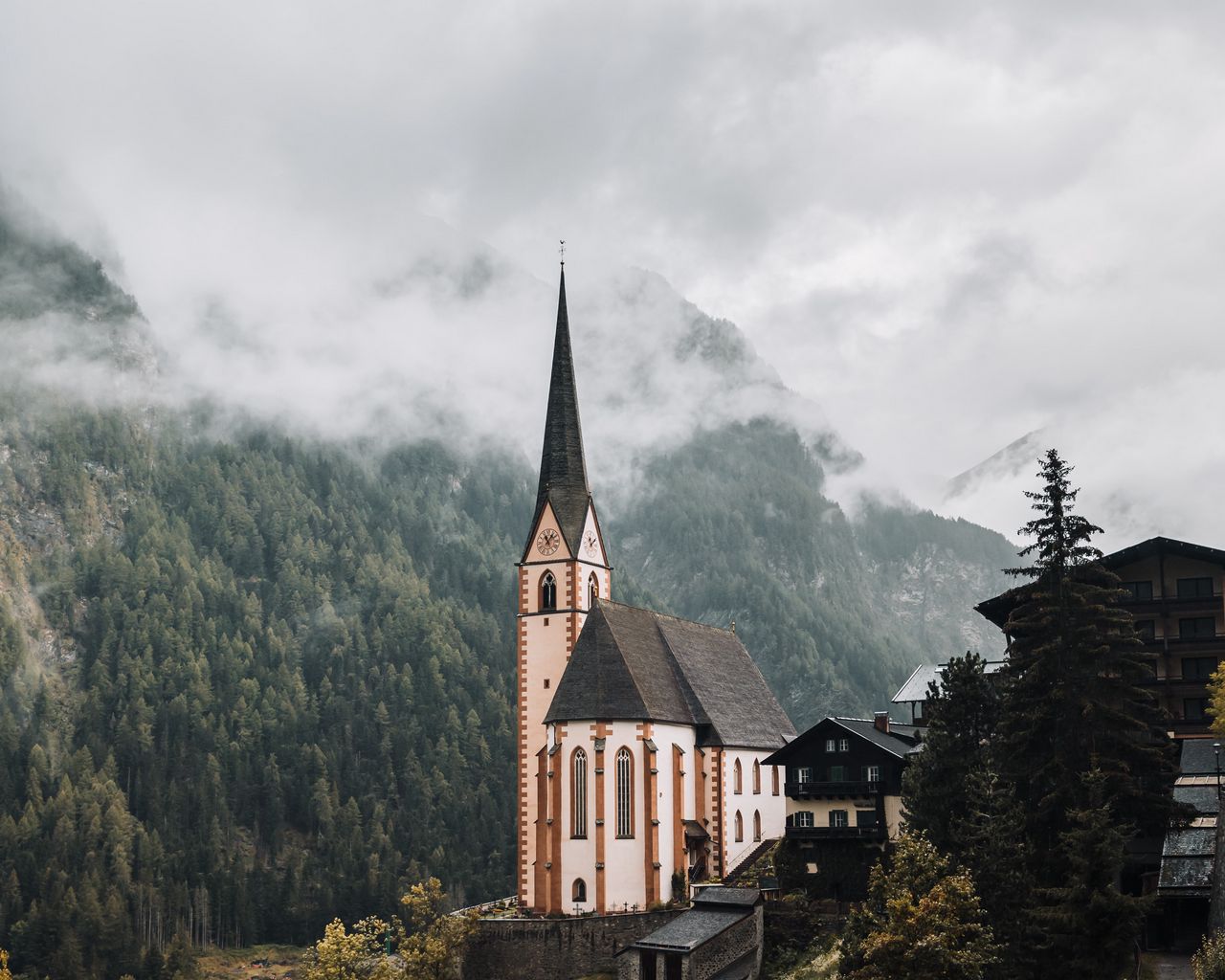 Download 1280x1024 building, architecture, forest, trees, tower, fog wallpaper, background standard 5:4