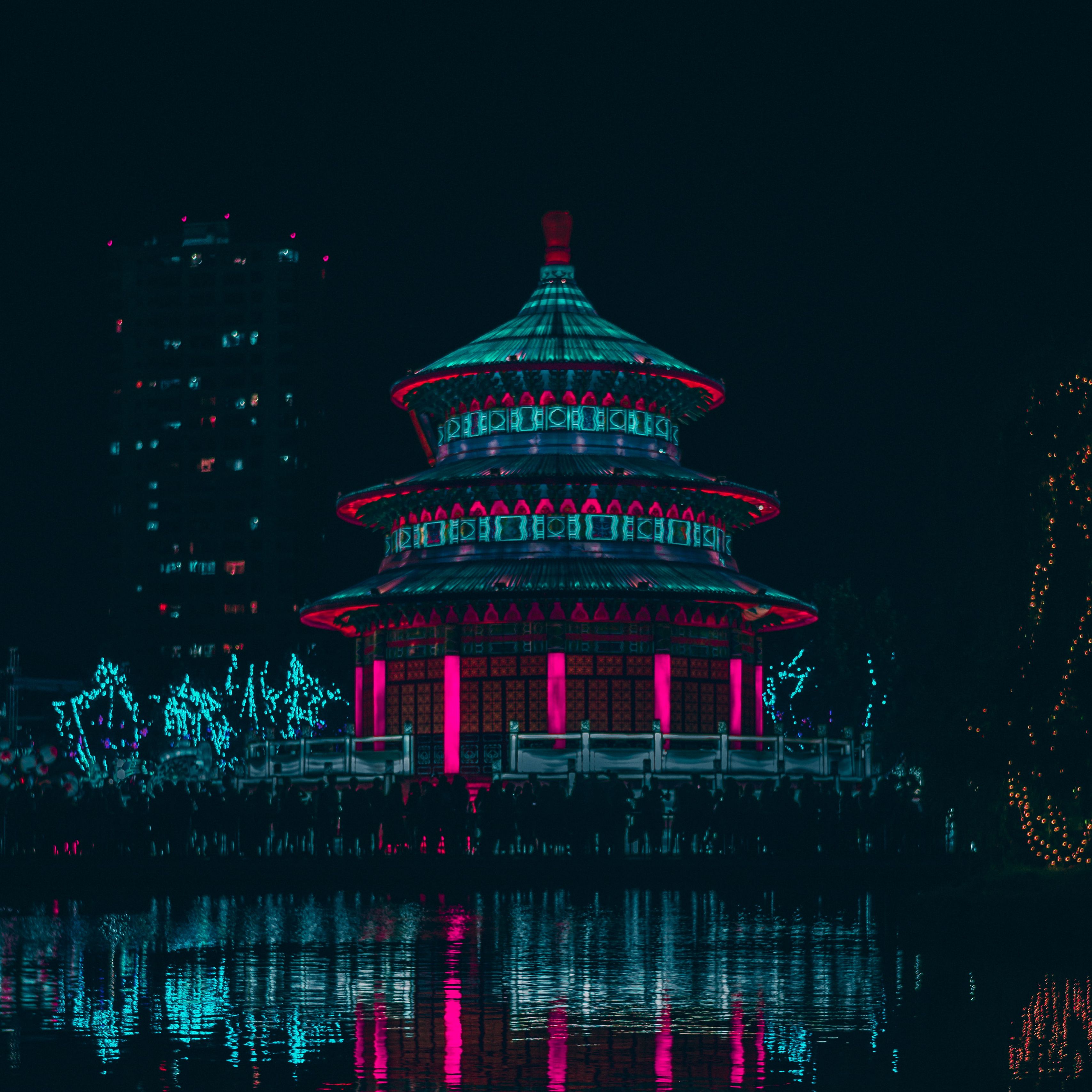 Download 3415x3415 building, neon, reflection, water wallpaper, background ipad pro 12.9" retina for parallax