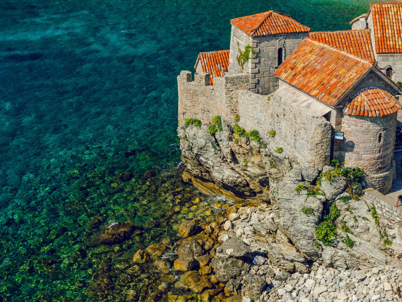 Download 1400x1050 buildings, rocks, coast, sea, nature wallpaper, background standard 4:3