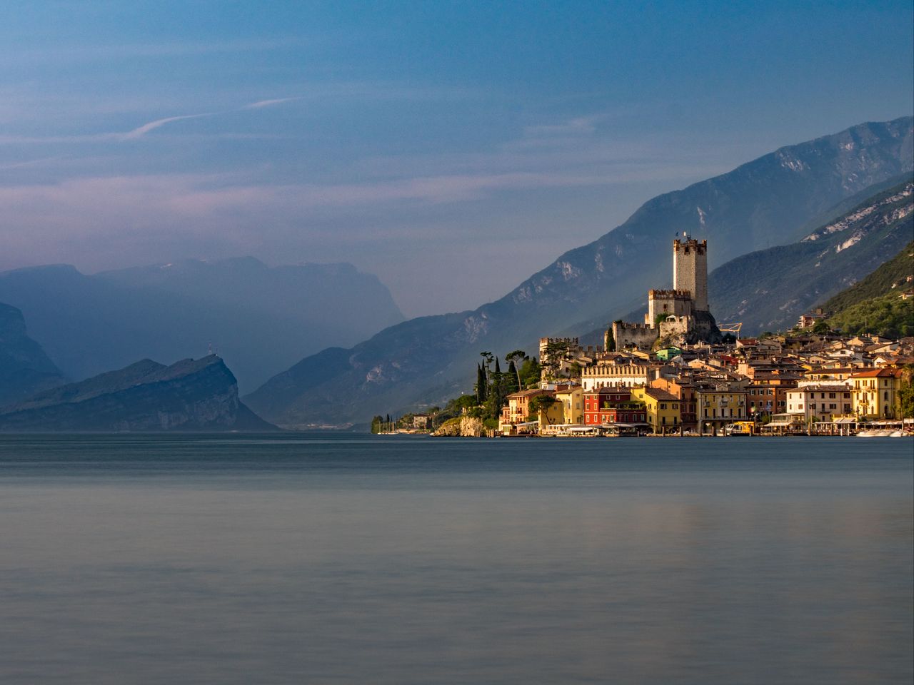 Download 1280x960 buildings, tower, mountains, sea, nature wallpaper, background standard 4:3