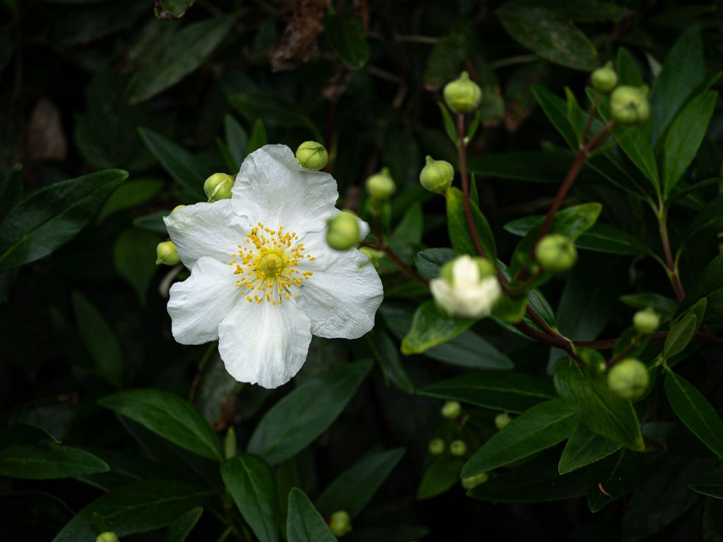 Download 1024x768 carpenteria, flower, leaves, buds, plant, macro wallpaper, background standard 4:3
