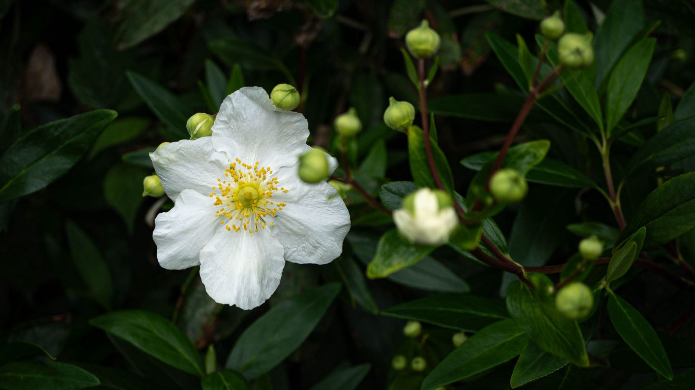 Download 1366x768 carpenteria, flower, leaves, buds, plant, macro wallpaper, background tablet, laptop