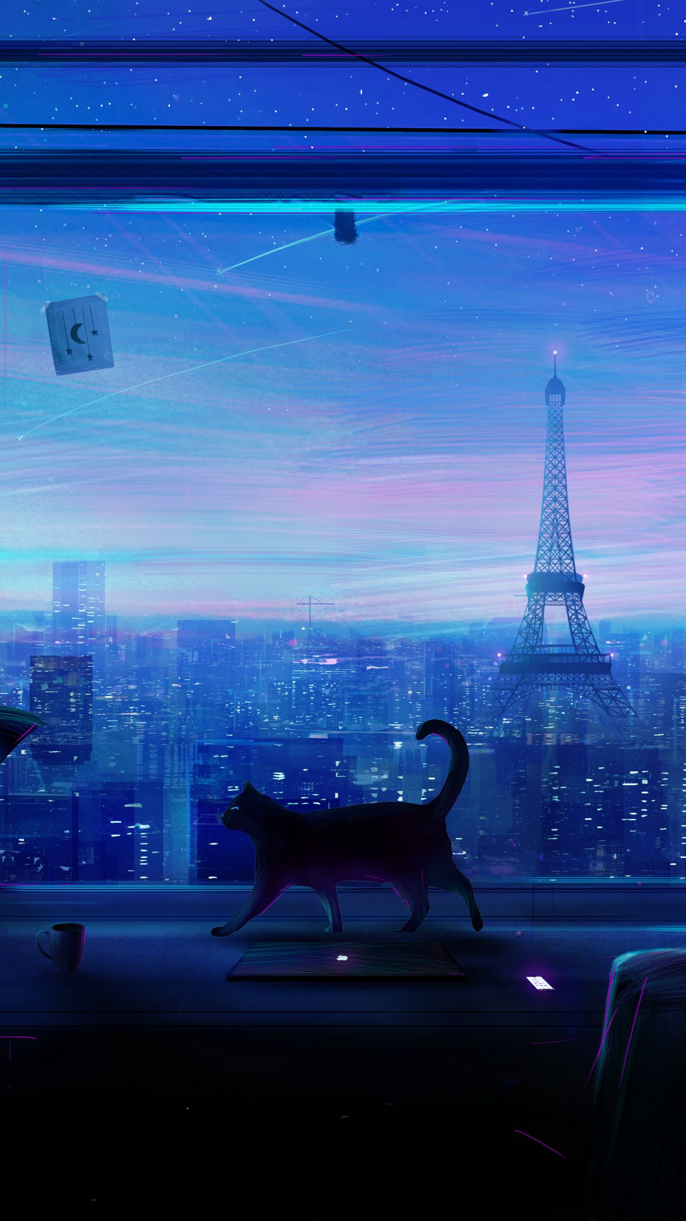 Download 1350x2400 cat, art, window, city, view wallpaper, background iphone 8+/7+/6s+/6+ for parallax