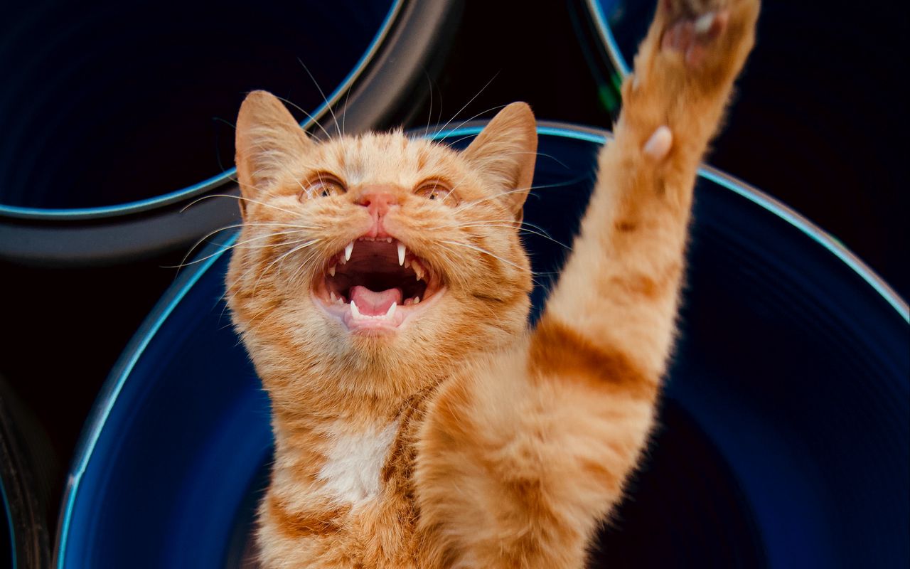 Download 1280x800 cat, paw, pet, red, funny wallpaper, background widescreen 16:10