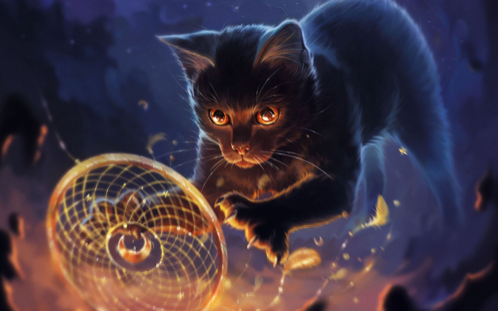 Download 1680x1050 cat, talisman, dreamcatcher, feathers, art wallpaper, background widescreen 16:10