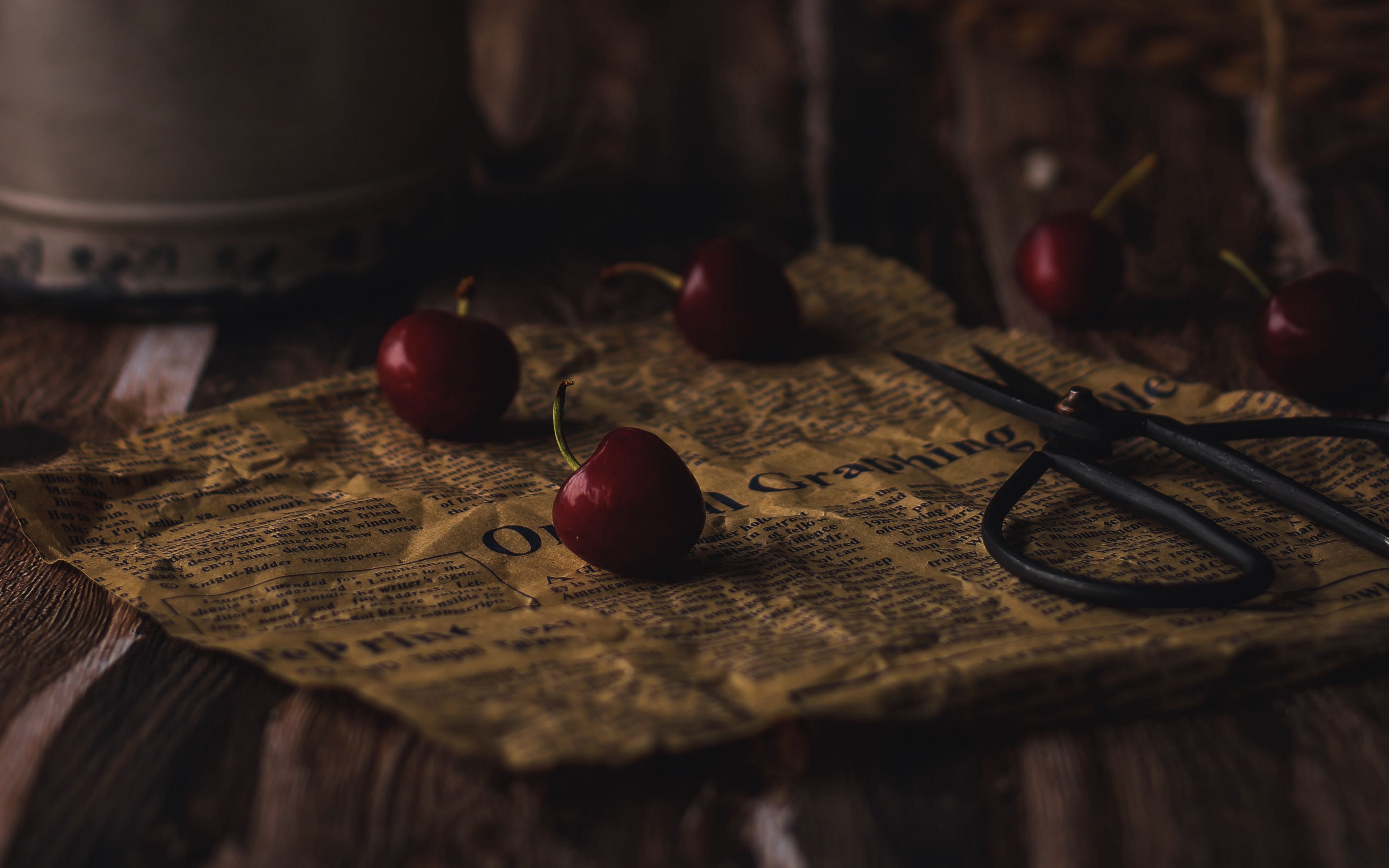 Download 3840x2400 cherries, berries, paper, scissors, basket wallpaper, background 4k ultra hd 16:10