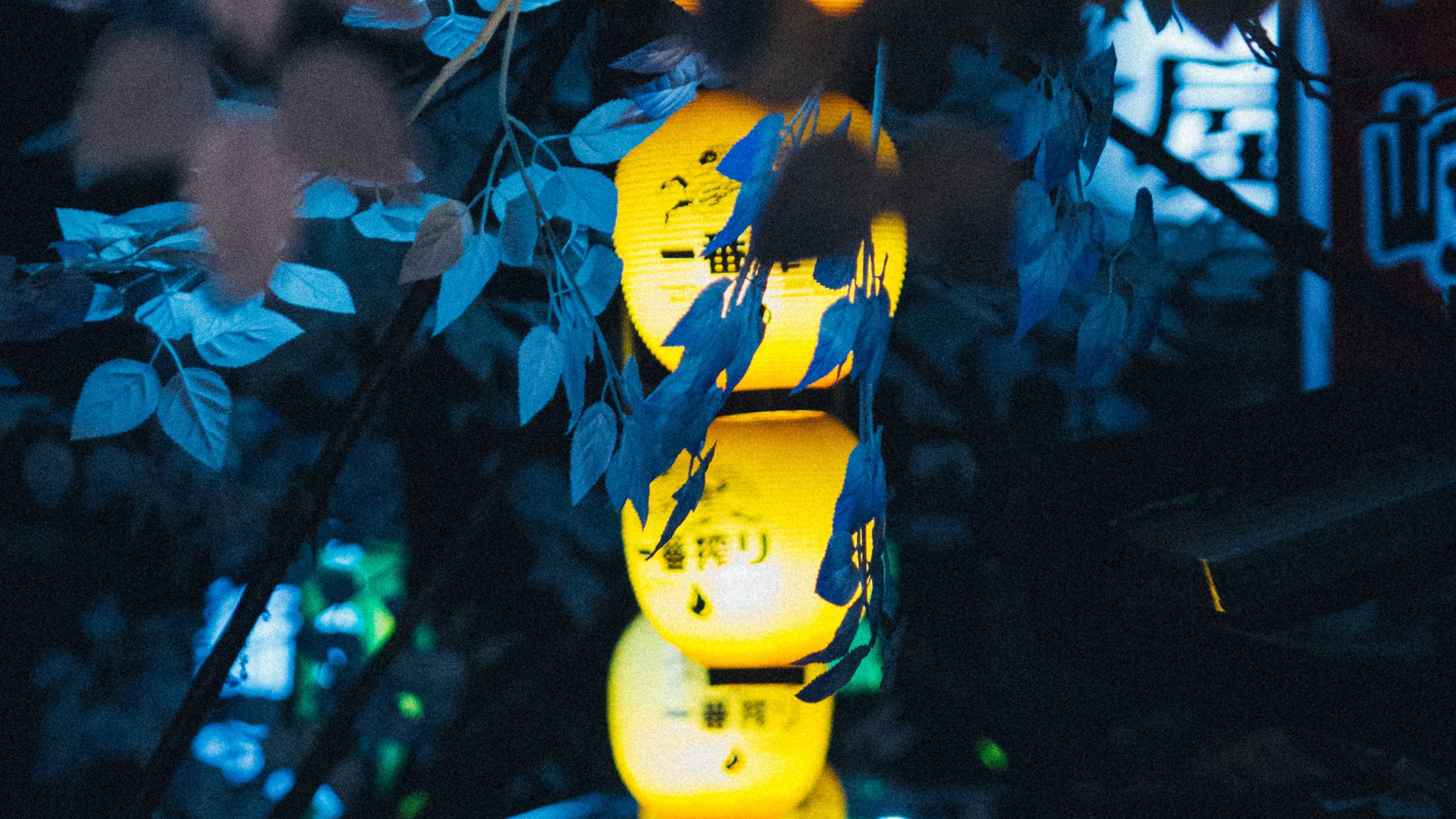 Download 2560x1440 chinese lanterns, branches, decoration, light, glow wallpaper, background widescreen 16:9