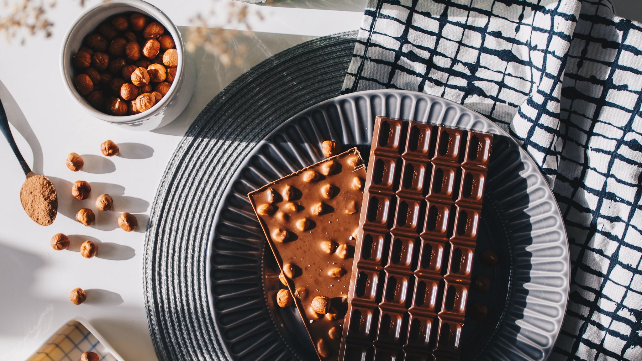 Download 2048x1152 chocolate, dessert, nuts, plate wallpaper, background ultrawide monitor