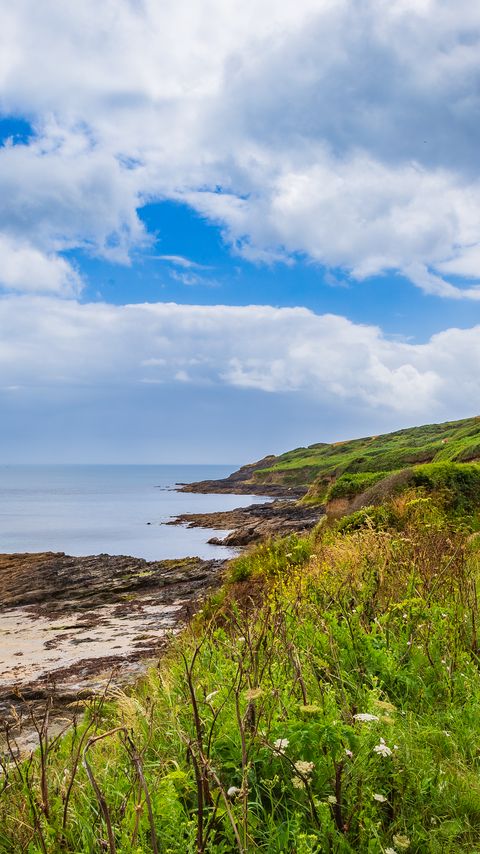 Download 480x854 coast, grass, sea, landscape, nature, clouds wallpaper, background nokia lumia 630, sony ericsson xperia