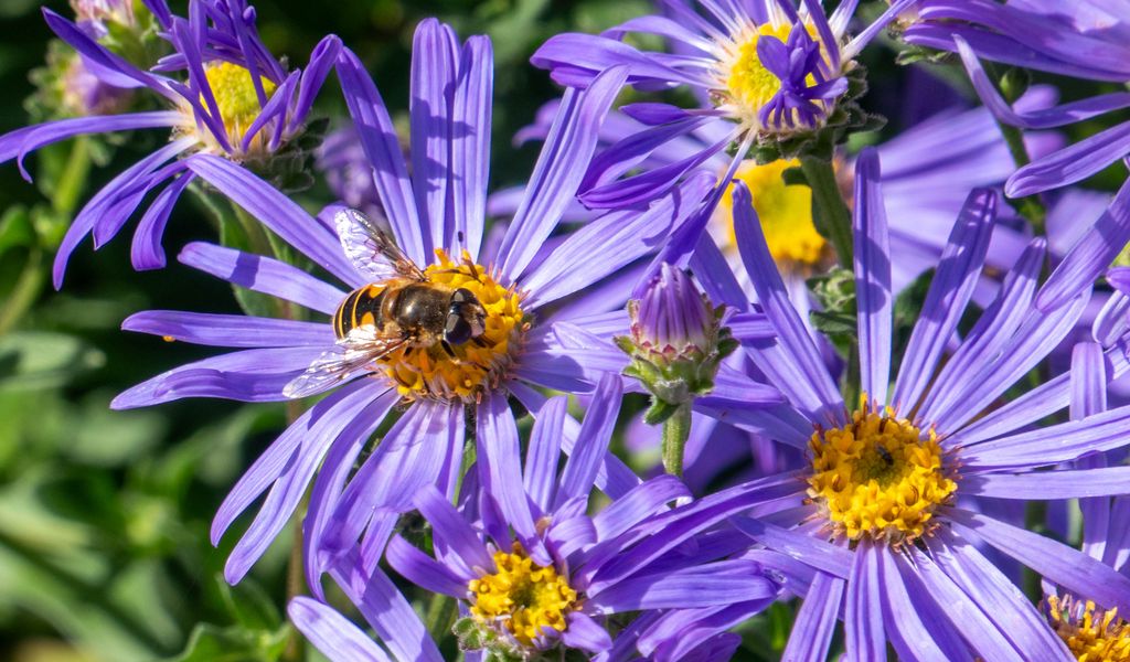 Download 1024x600 cornflowers, flowers, bee, petals, macro, purple wallpaper, background netbook, tablet