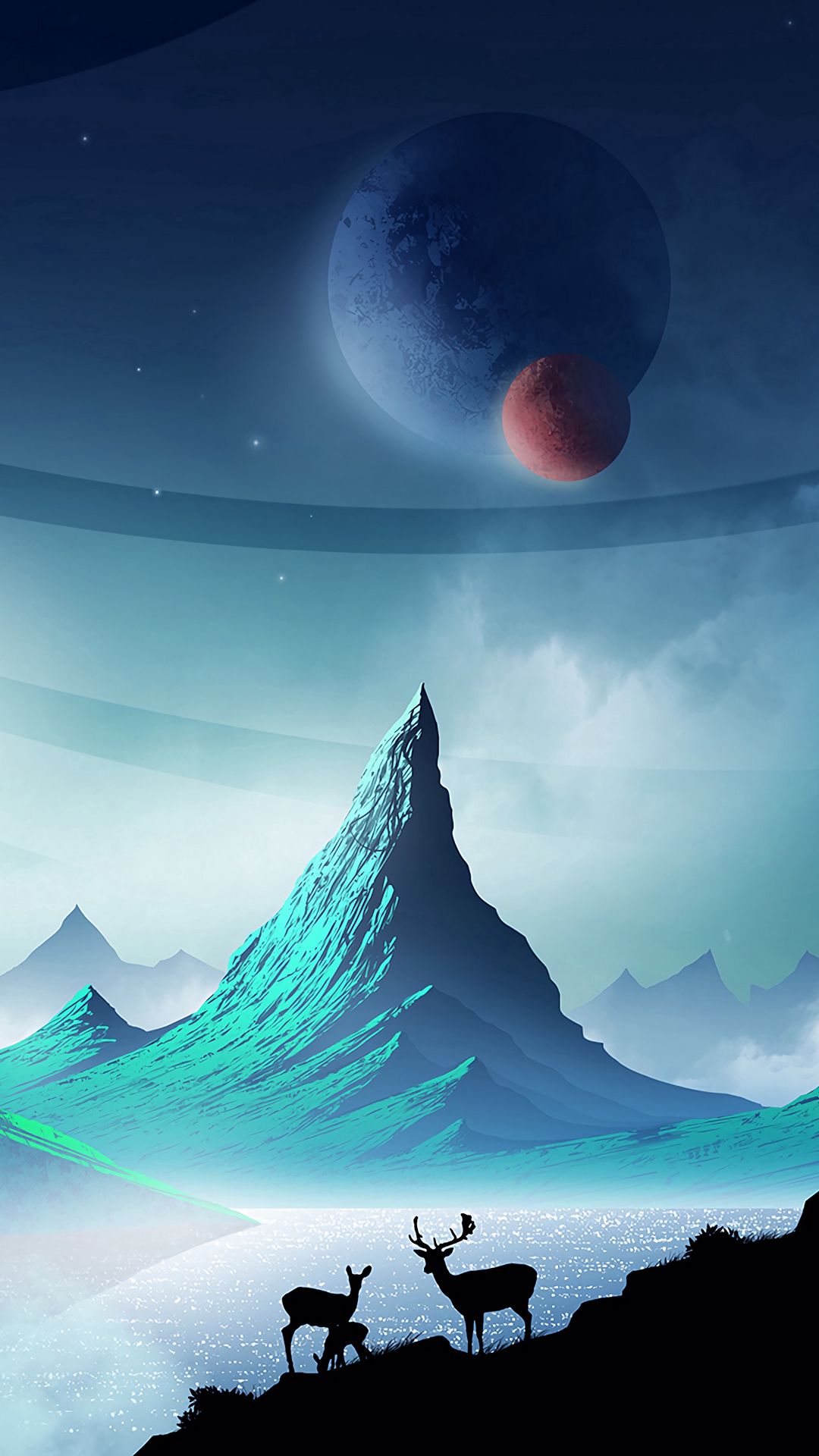 Download 1080x1920 deer, mountains, art, landscape, night, space wallpaper, background samsung galaxy s4, s5, note, sony xperia z, z1, z2, z3, htc one, lenovo vibe