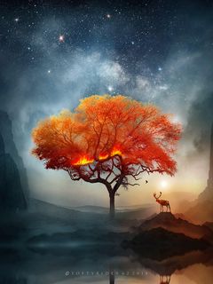 Download 240x320 deer, tree, art, fire, fantastic wallpaper, background old mobile, cell phone, smartphone