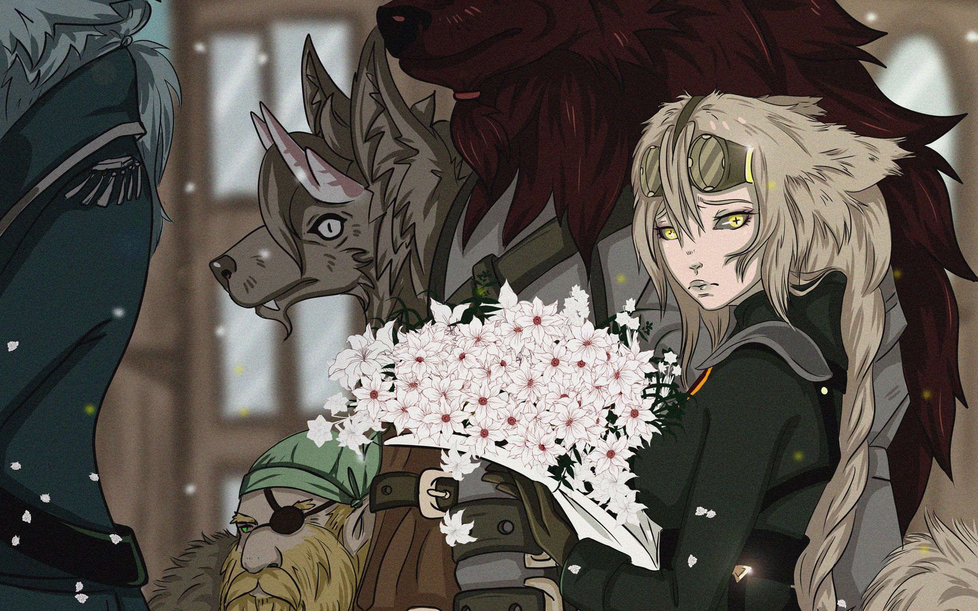 Download 1920x1200 dog girl, girl, flowers, werewolf, anime, art wallpaper, background widescreen 16:10