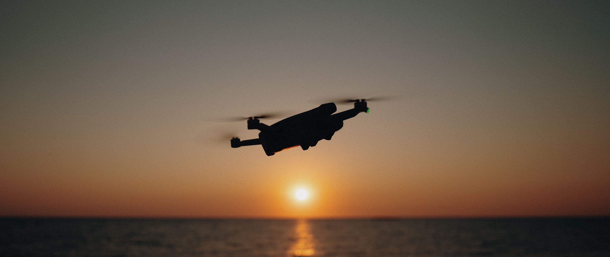 Download 2560x1080 drone, silhouette, sea, glare, sky, sunset wallpaper, background dual wide 1080p