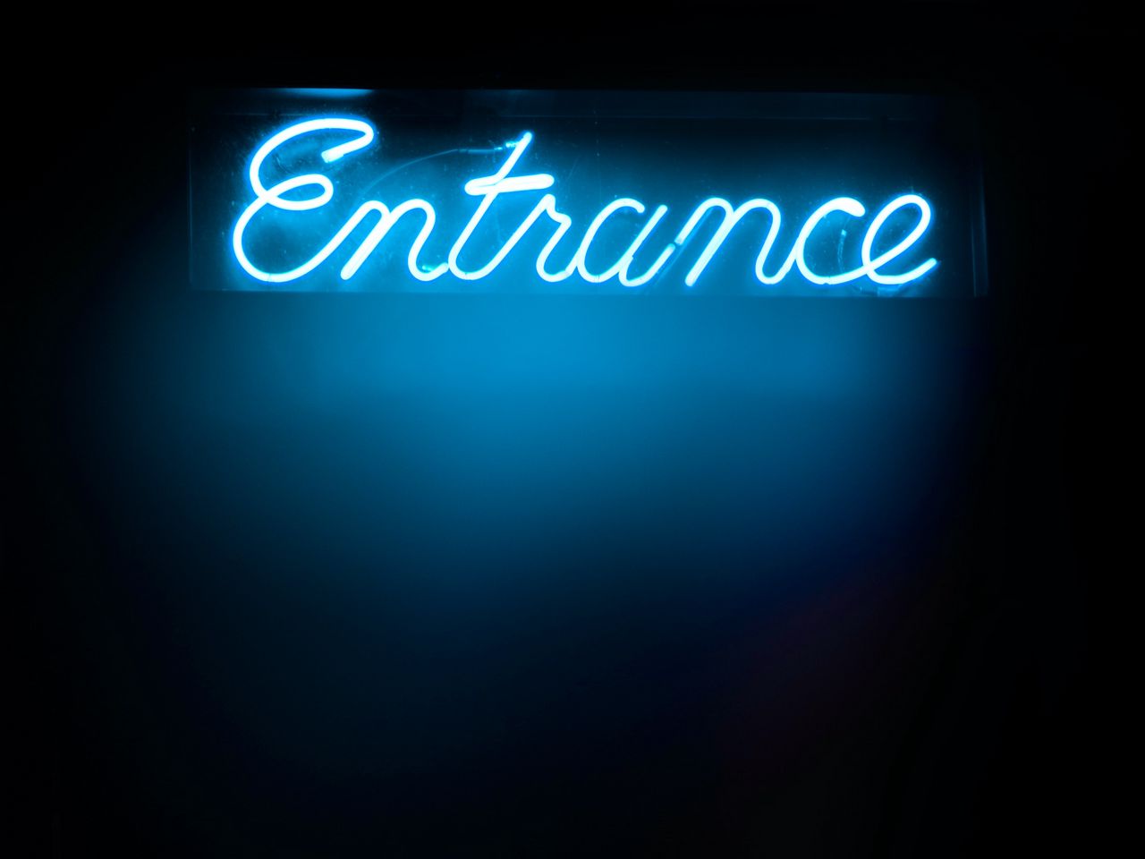 Download 1280x960 entrance, word, neon, light, blue, dark wallpaper, background standard 4:3