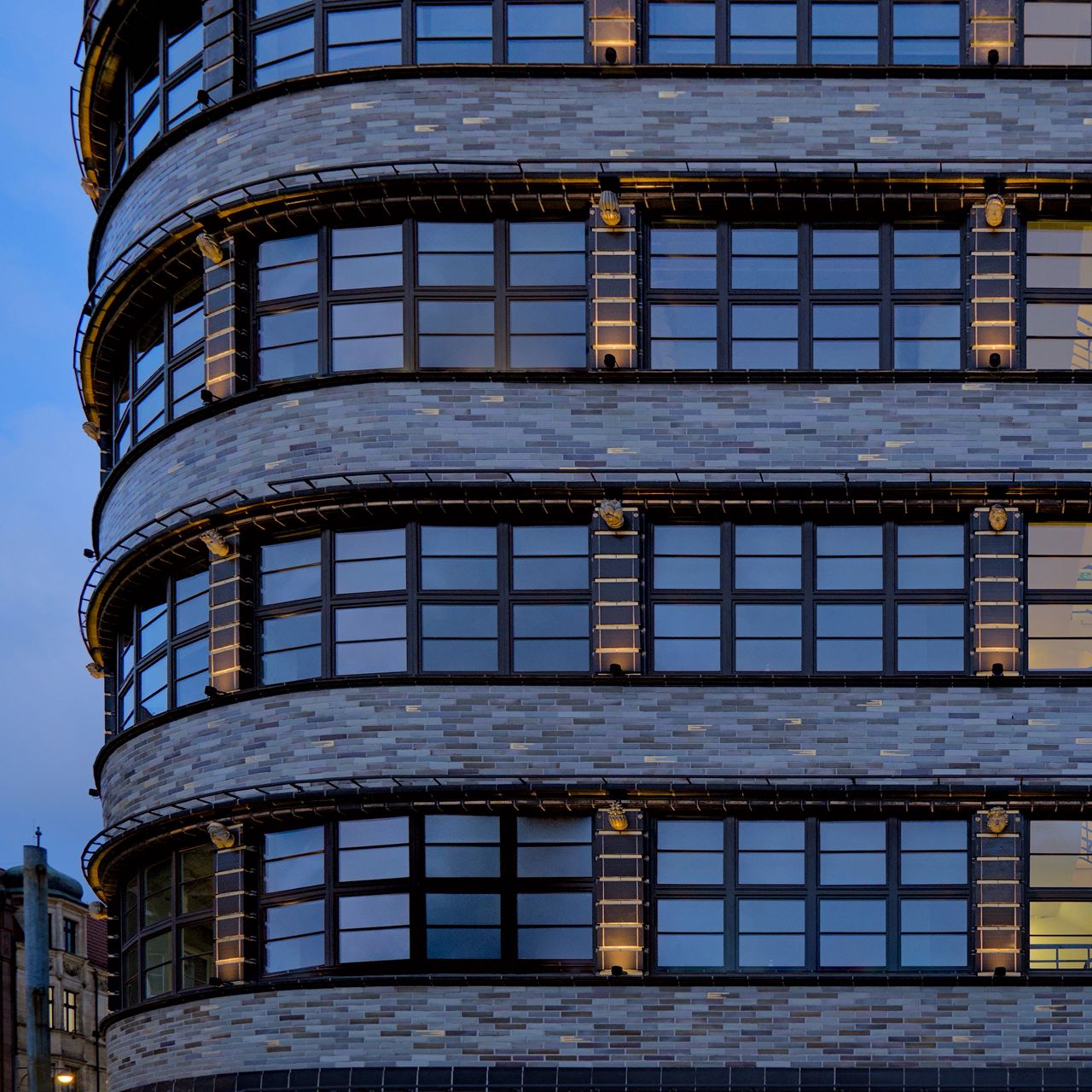 Download 1280x1280 facade, windows, architecture, evening wallpaper, background ipad, ipad 2, ipad mini for parallax