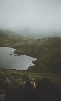 Download 240x400 feet, lake, fog, hills, slope wallpaper, background nokia asha 311, samsung galaxy 580, omnia, lg kp500