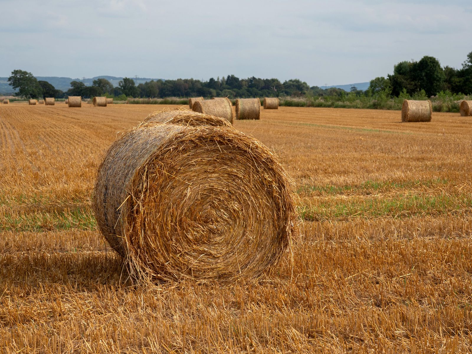 Download 1600x1200 field, hay, trees, sky, landscape wallpaper, background standard 4:3