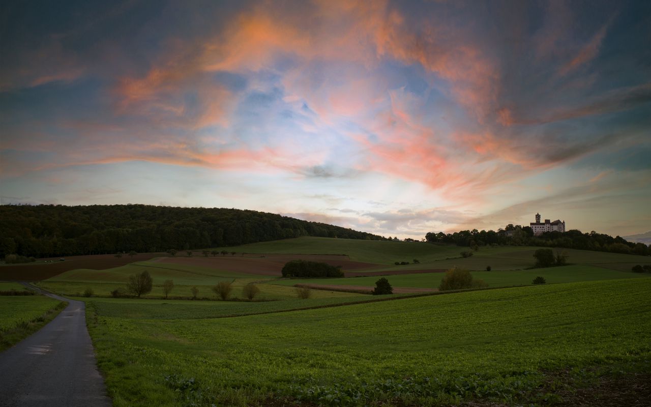 Download 1280x800 fields, hills, castle, landscape wallpaper, background widescreen 16:10
