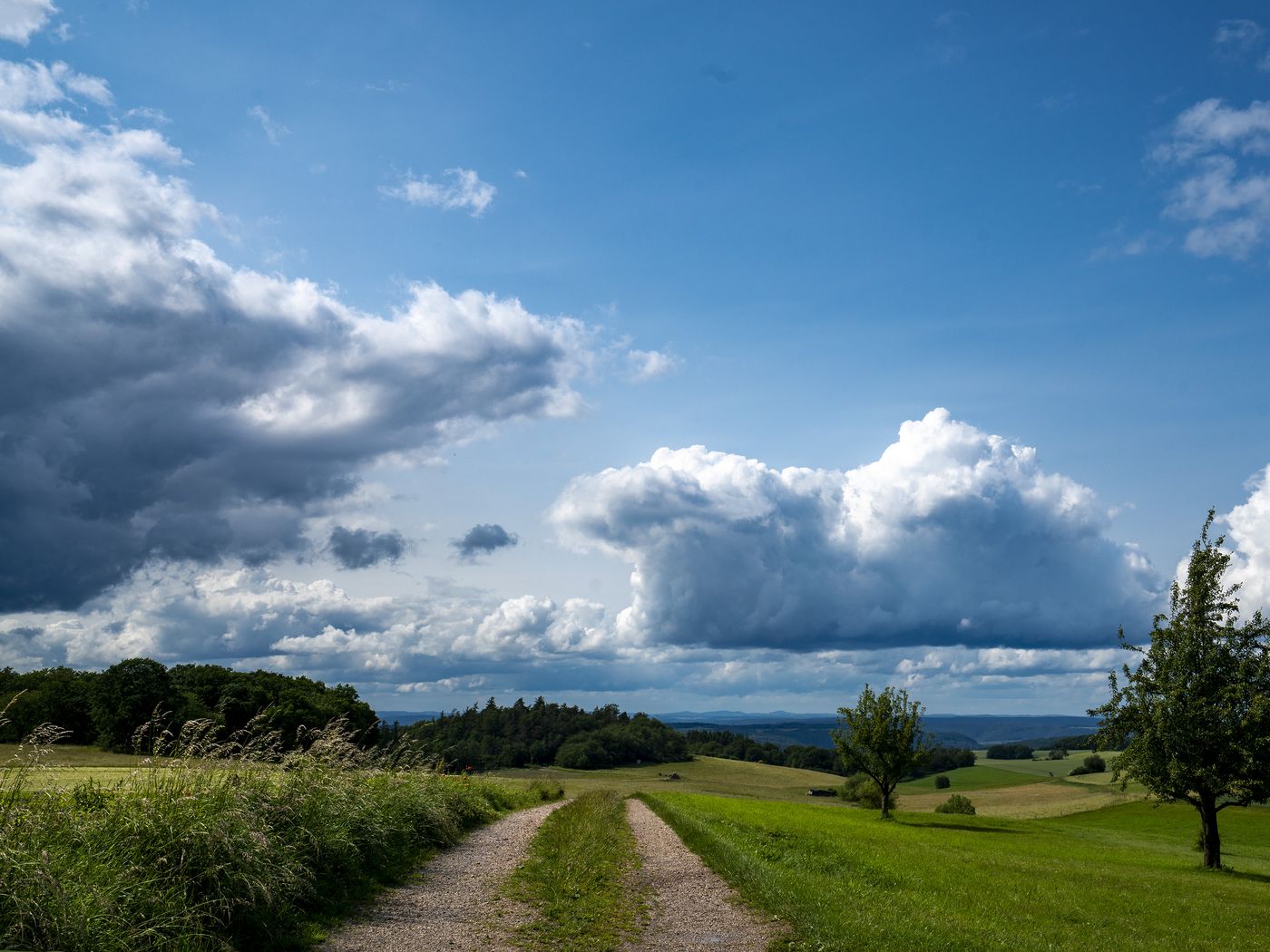 Download 1400x1050 fields, trees, bushes, clouds, sky, landscape wallpaper, background standard 4:3