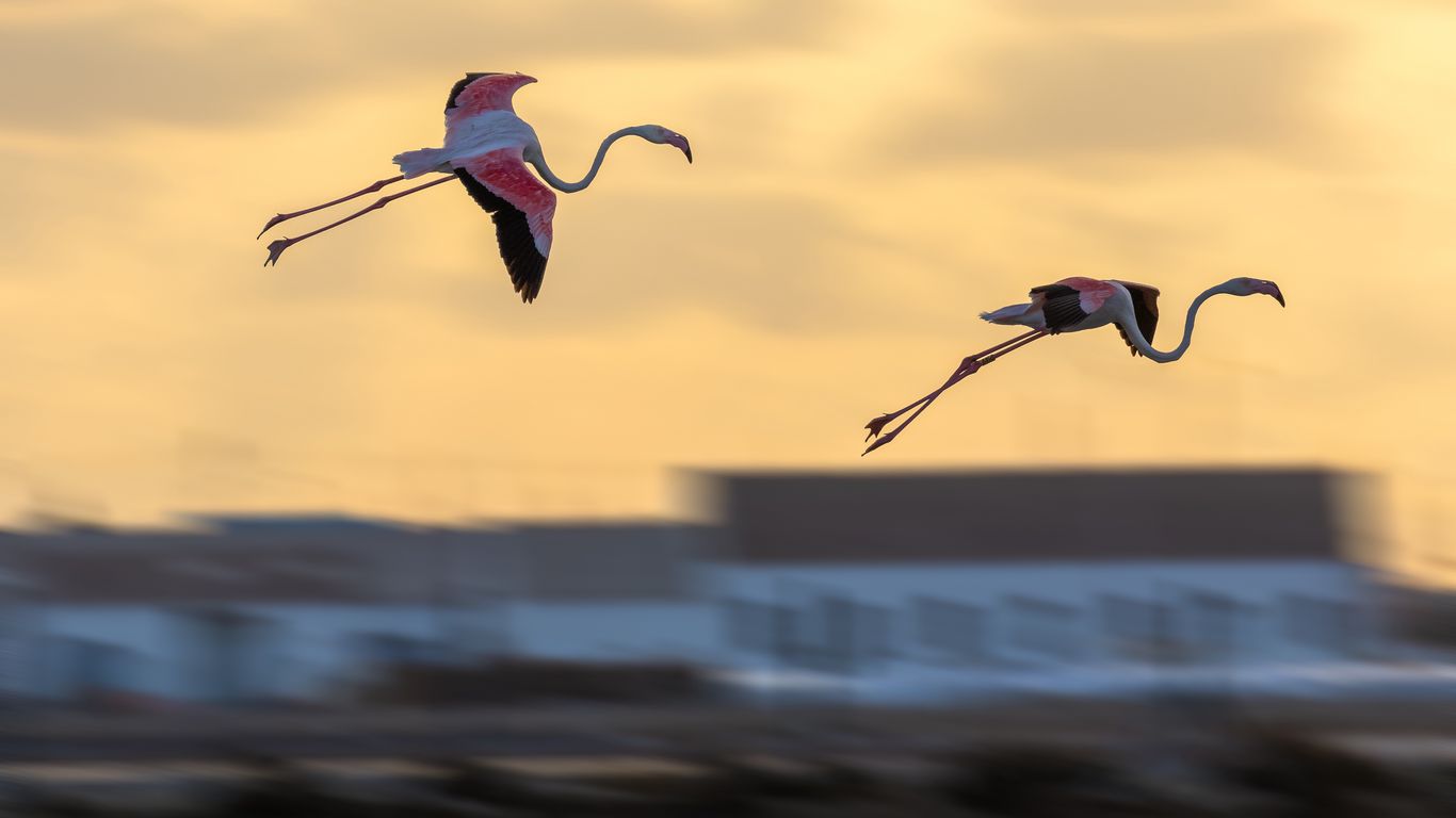 Download 1366x768 flamingo, birds, flight, blur wallpaper, background tablet, laptop