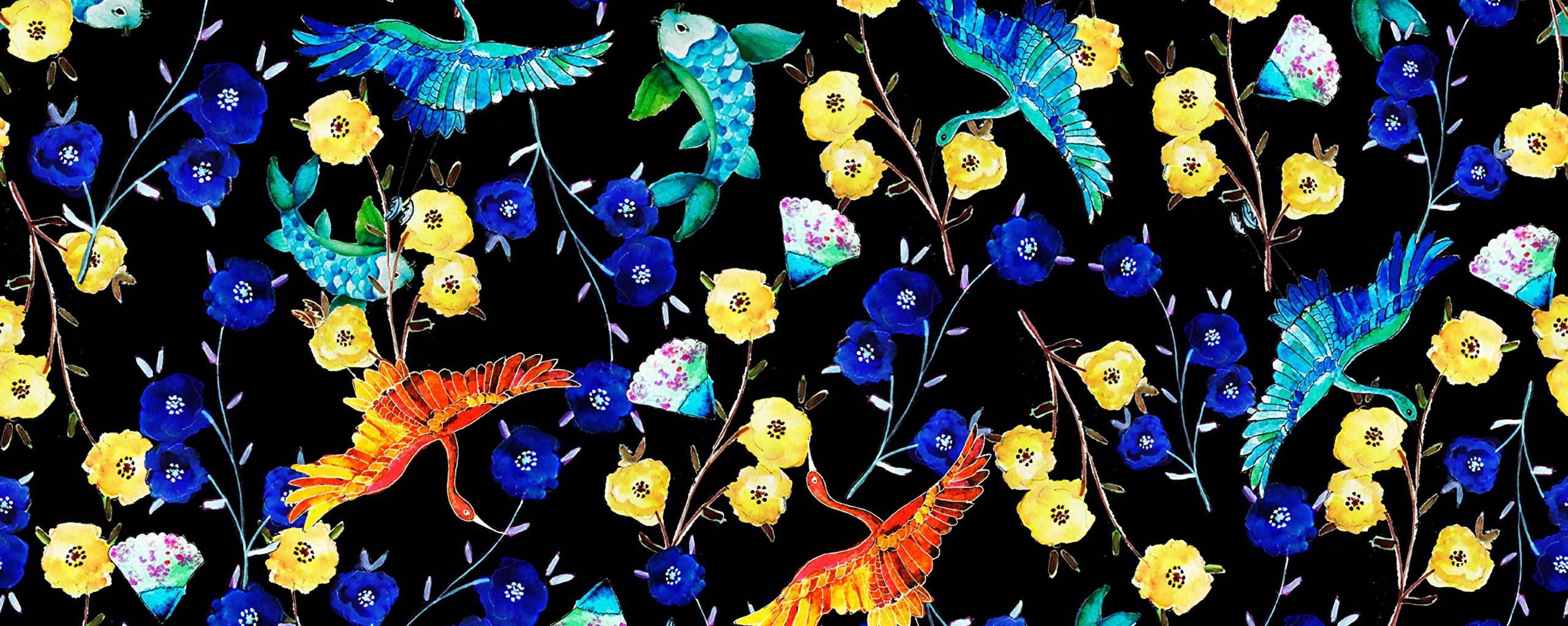 Download 2560x1024 flowers, birds, fish, pattern, art wallpaper, background ultrawide monitor