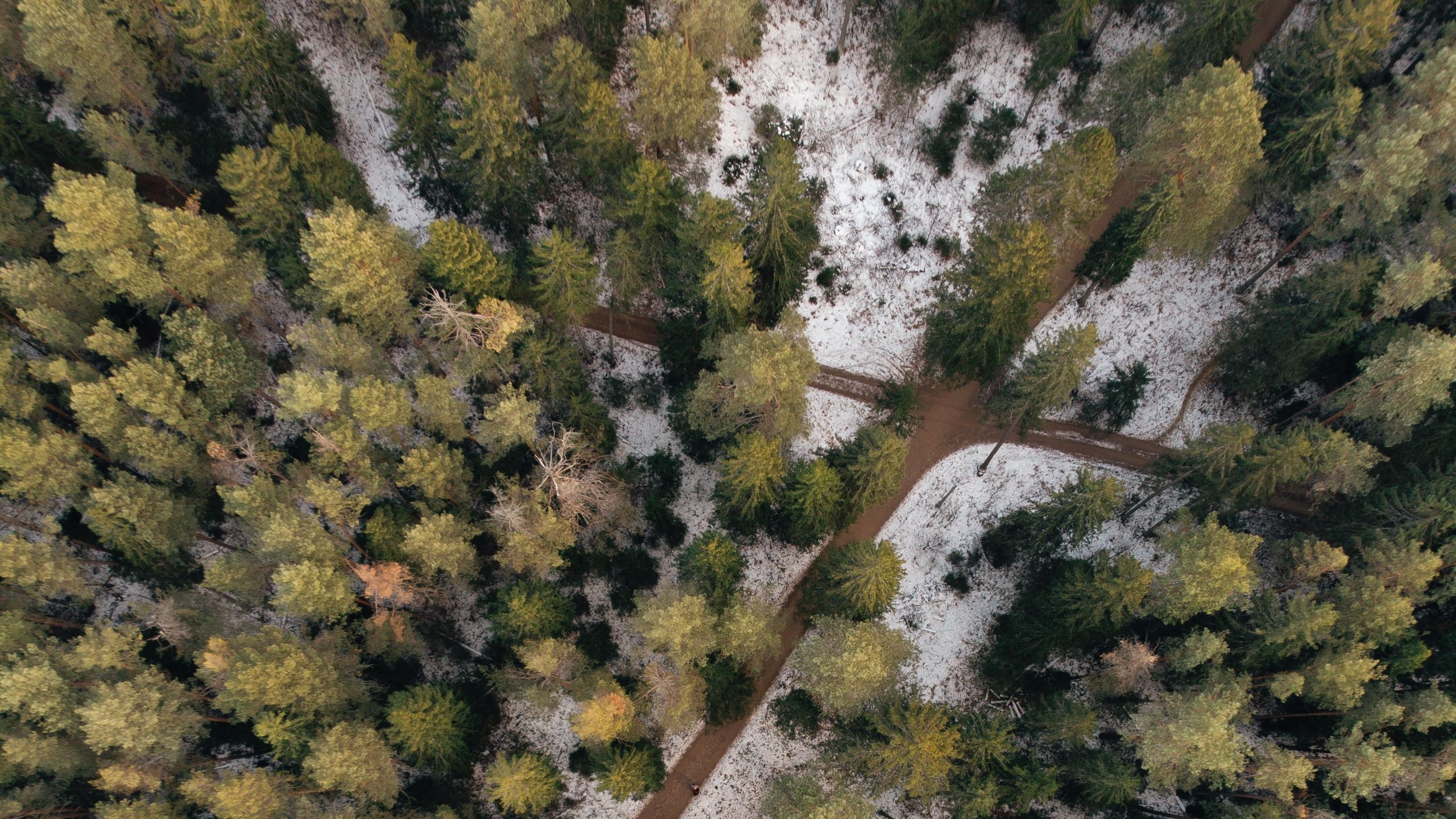 Download 2560x1440 forest, paths, aerial view, trees, snow wallpaper, background widescreen 16:9