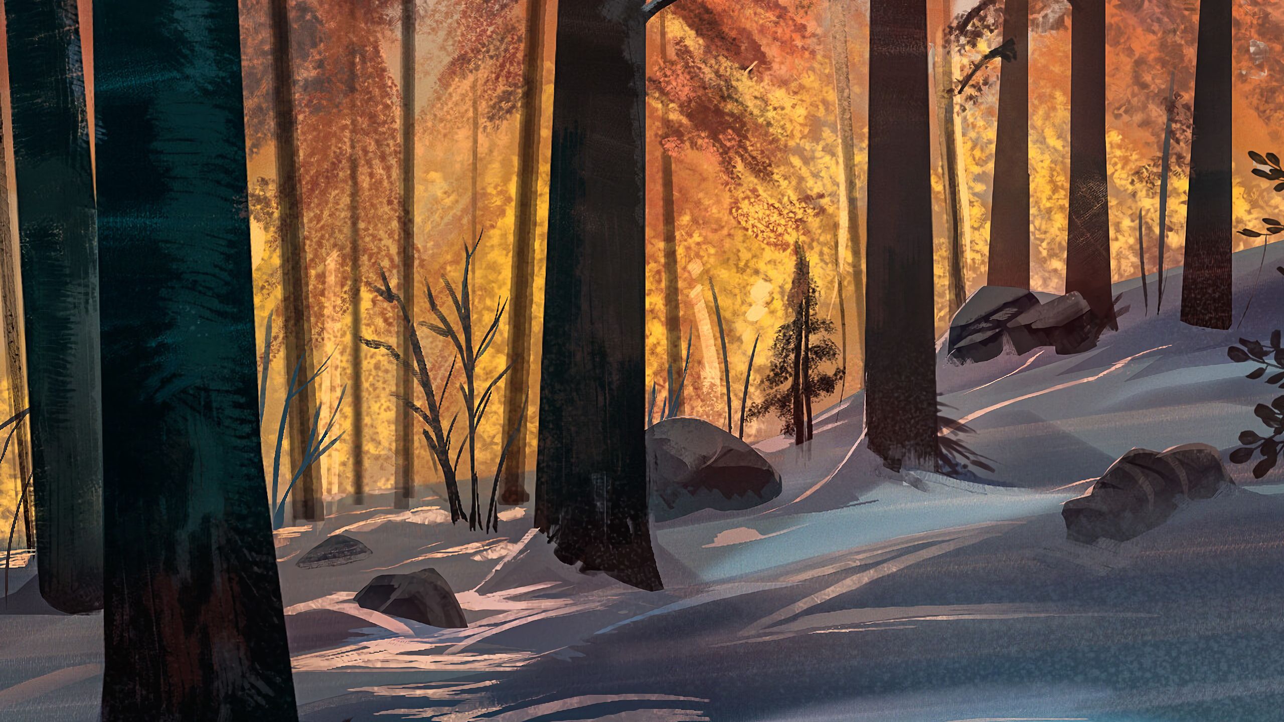 Download 2560x1440 forest, trees, snow, landscape, art wallpaper, background widescreen 16:9