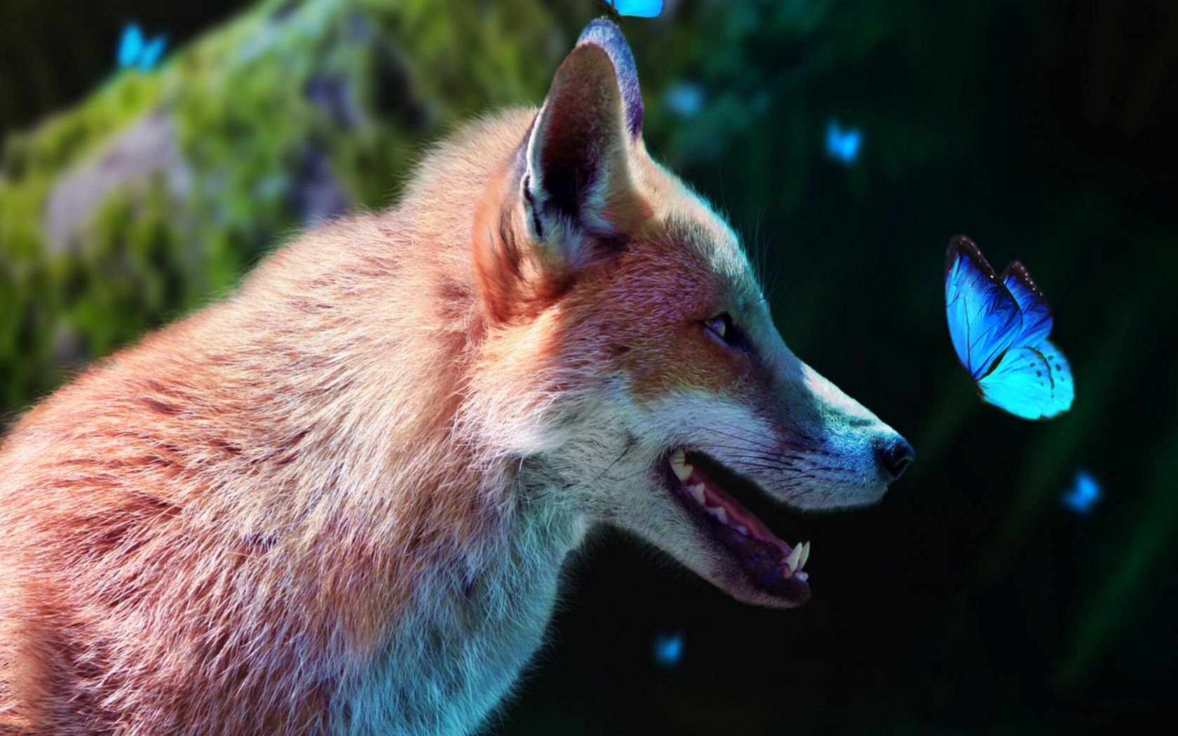 Download 1680x1050 fox, butterflies, cute, animal, wildlife wallpaper, background widescreen 16:10