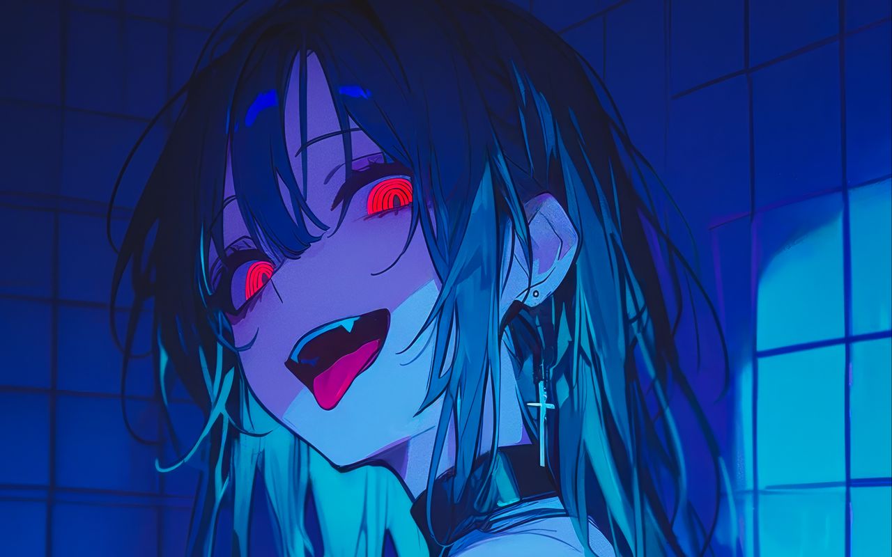 Download 1280x800 girl, vampire, bathroom, fangs, art, anime, blue wallpaper, background widescreen 16:10