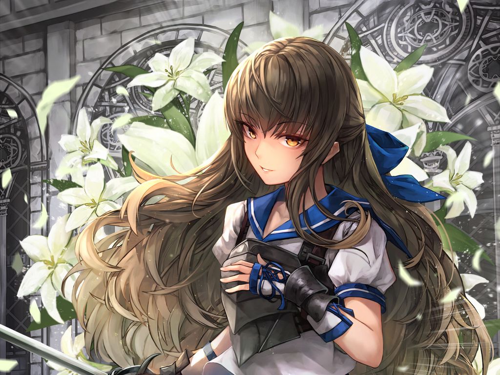 Download 1024x768 girl, warrior, sword, lilies, anime, art wallpaper, background standard 4:3