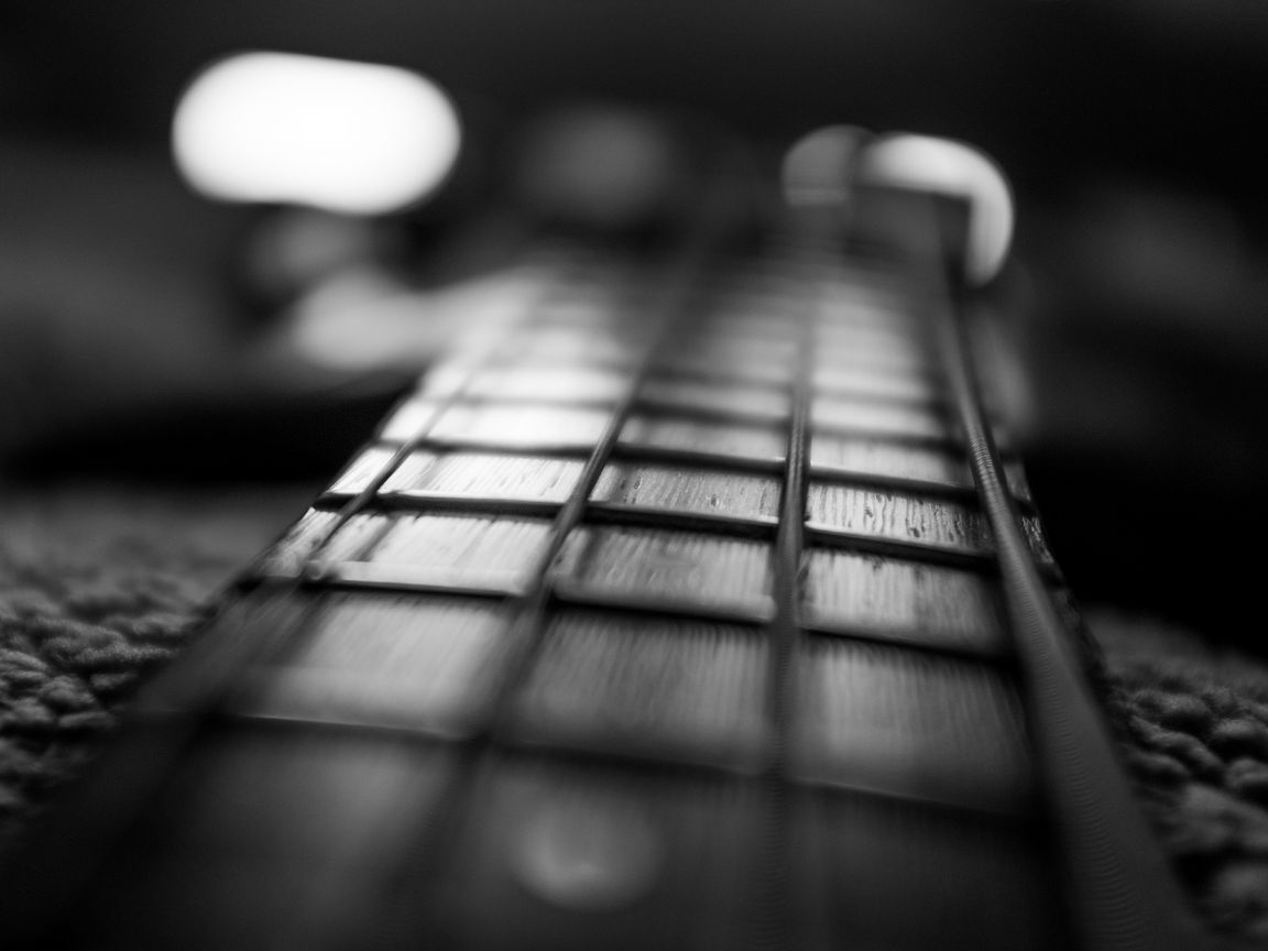 Download 1152x864 guitar, fretboard, strings, music, black and white wallpaper, background standard 4:3
