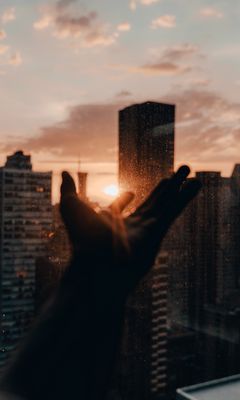 Download 240x400 hand, rays, sun, city, sunset wallpaper, background nokia asha 311, samsung galaxy 580, omnia, lg kp500