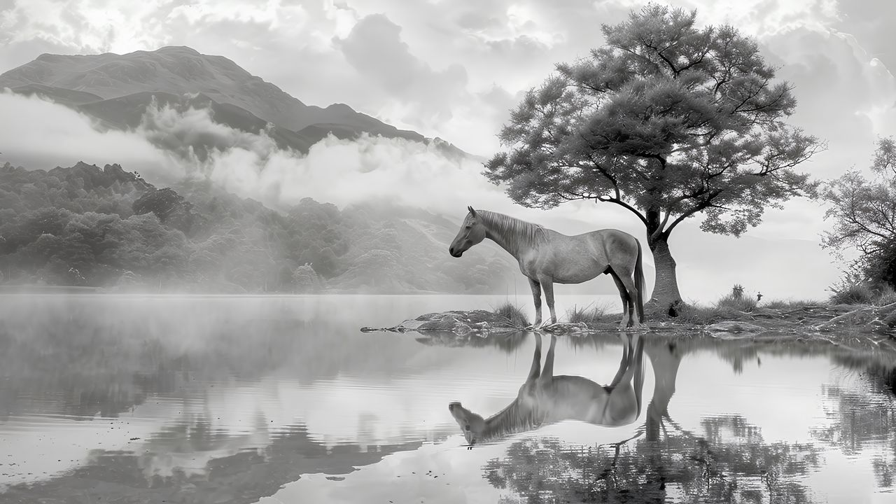 Download 1280x720 horse, tree, reflection, pond, bw wallpaper, background hd, hdv, 720p