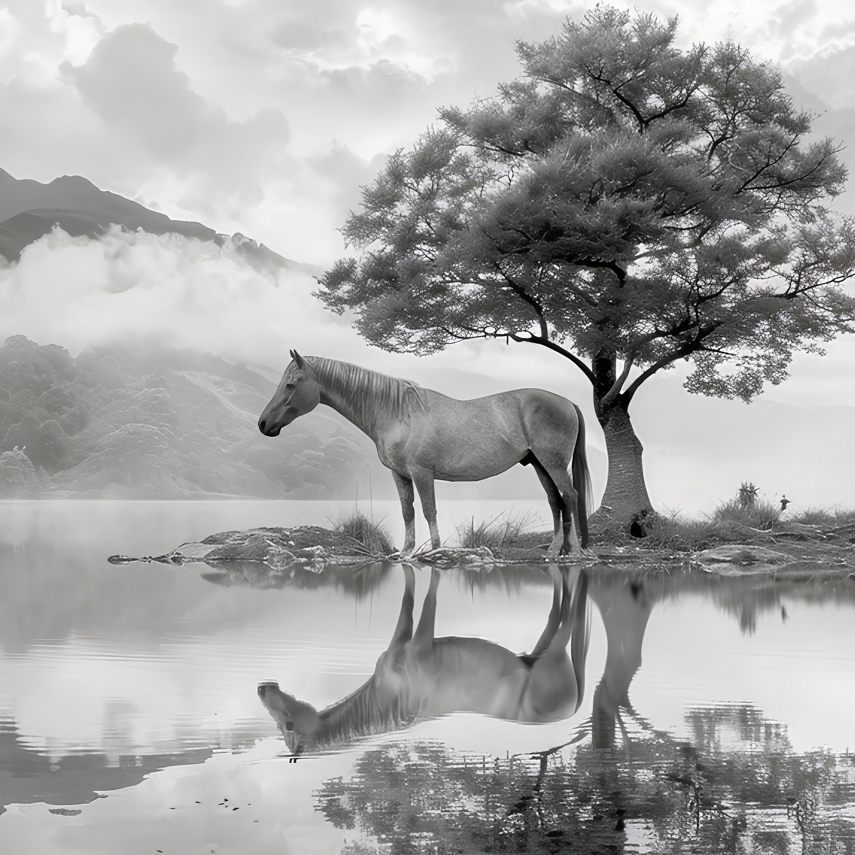 Download 2780x2780 horse, tree, reflection, pond, bw wallpaper, background ipad air, ipad air 2, ipad 3, ipad 4, ipad mini 2, ipad mini 3, ipad mini 4, ipad pro 9.7" for parallax