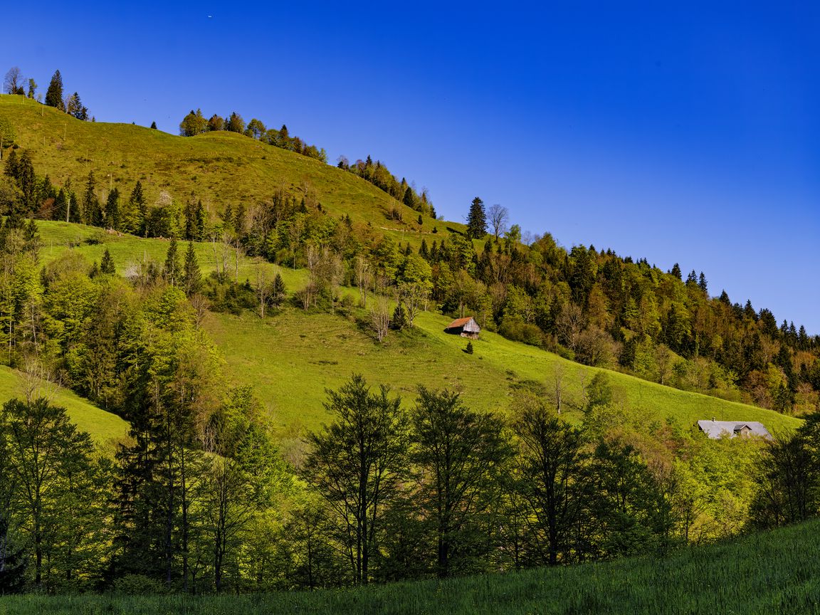 Download 1152x864 house, trees, hill, mountains, sky, nature wallpaper, background standard 4:3