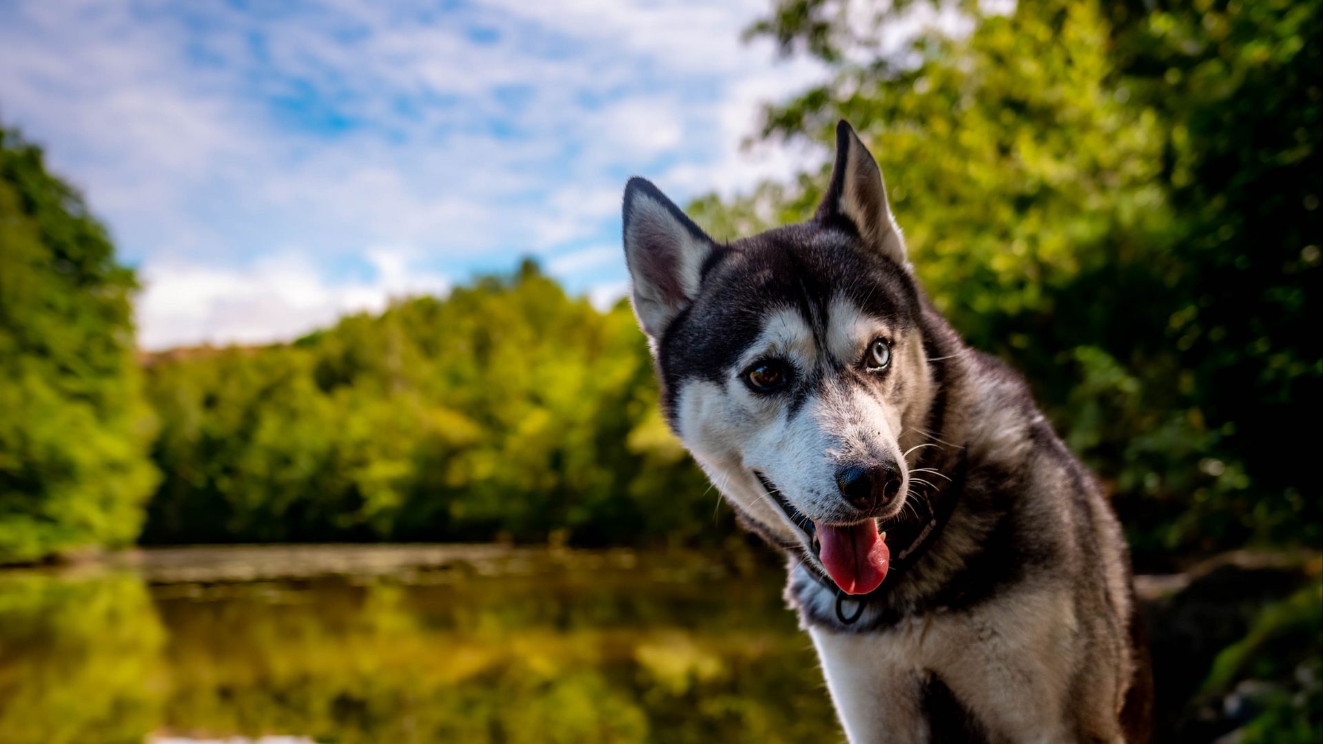 Download 1920x1080 husky, dog, pet, shore, heterochromia wallpaper, background full hd, hdtv, fhd, 1080p