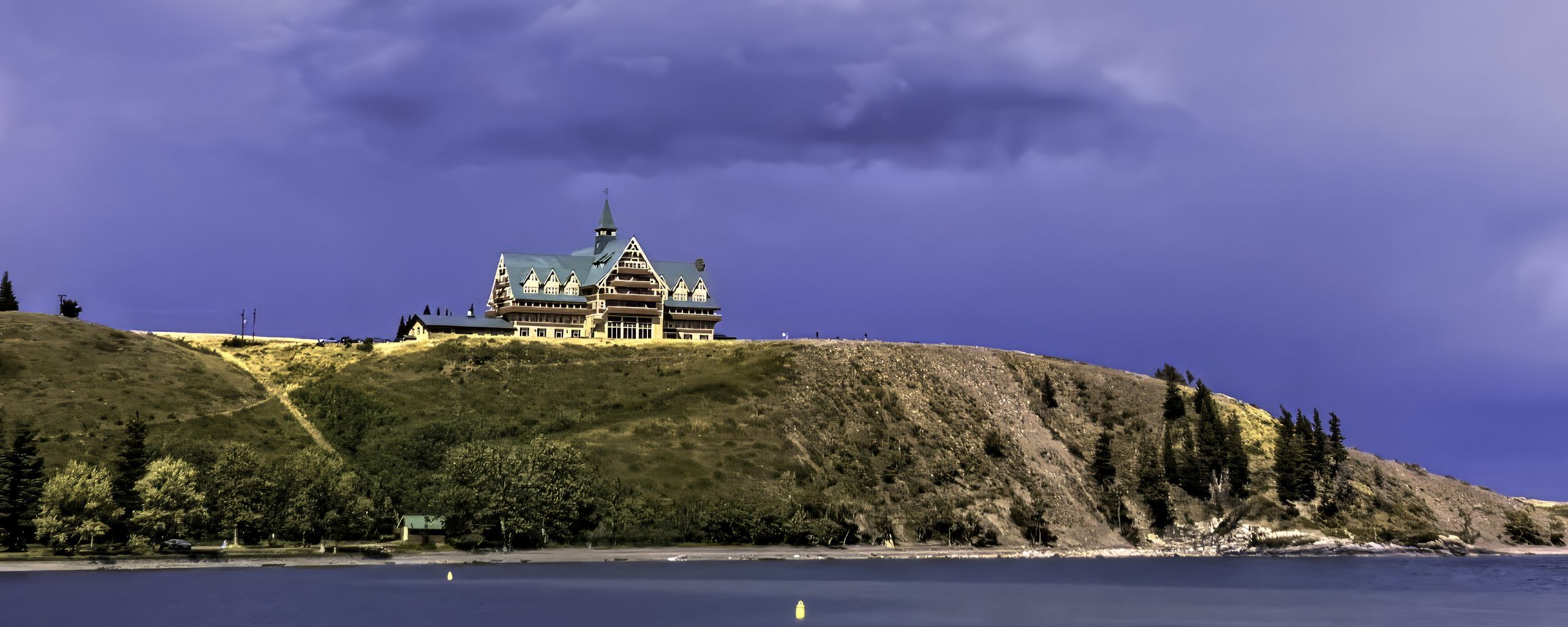 Download 2560x1024 island, building, hill, sea, landscape wallpaper, background ultrawide monitor