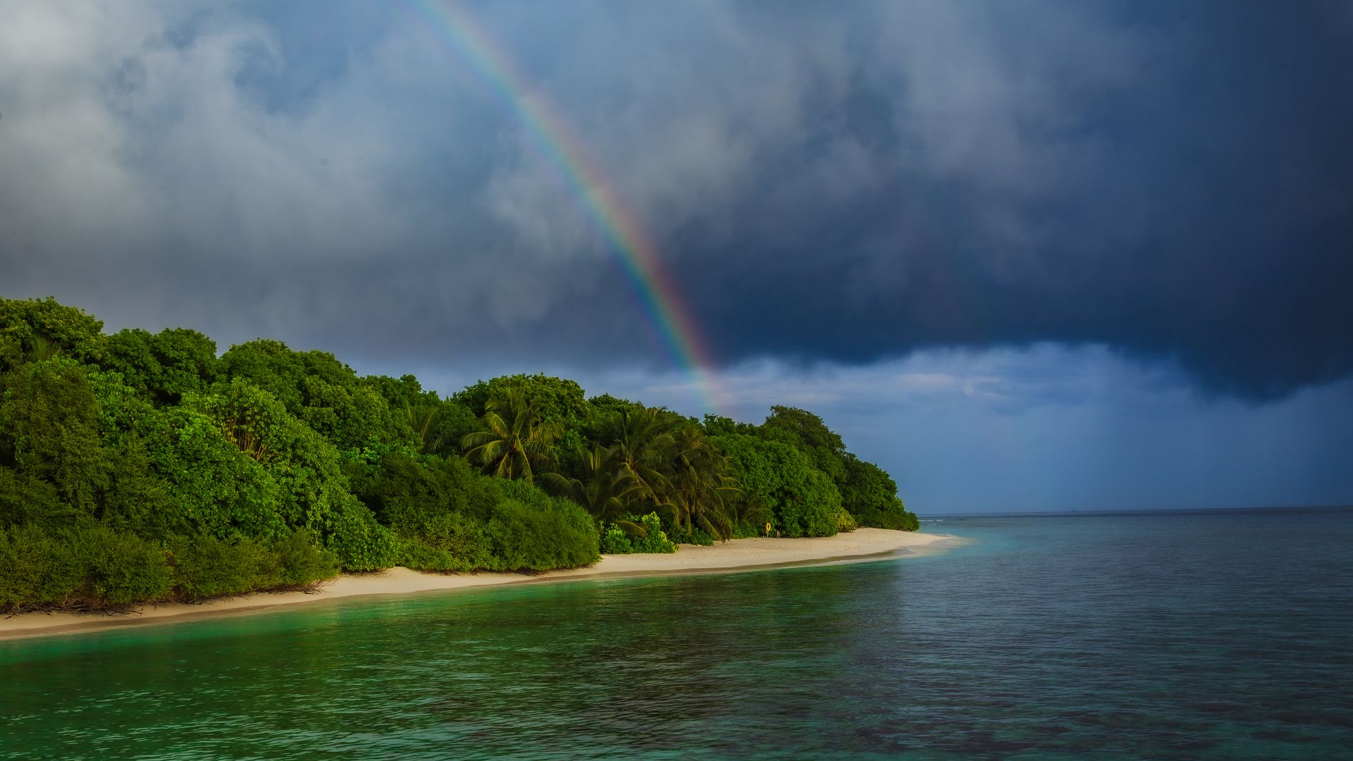 Download 1920x1080 island, trees, sea, ocean, rainbow wallpaper, background full hd, hdtv, fhd, 1080p