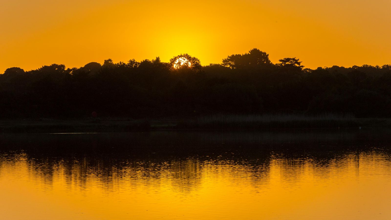 Download 1600x900 lake, trees, sunset, reflection, sky, ripples wallpaper, background widescreen 16:9