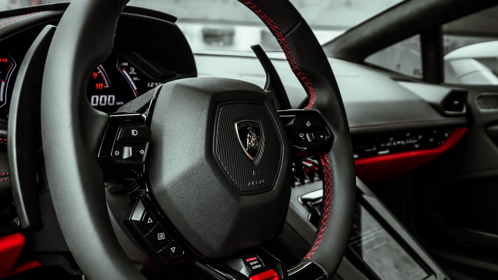 Download 1600x900 lamborghini, car, steering wheel, salon, seat, red wallpaper, background widescreen 16:9